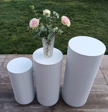 Nouvels articles disponibles à la location : mur de fleurs artificielles blanches & présentoirs colonnes