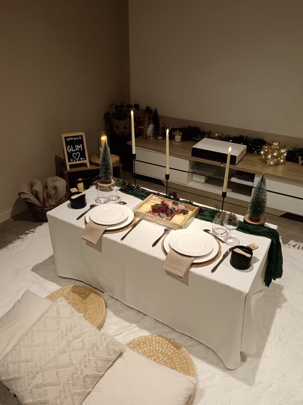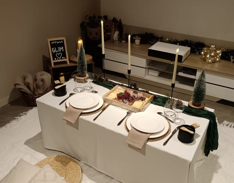 Décoration : nappe, chemin de table, set de table, tableau ardoise personnalisé, bougies led et décoration selon le thème choisi.